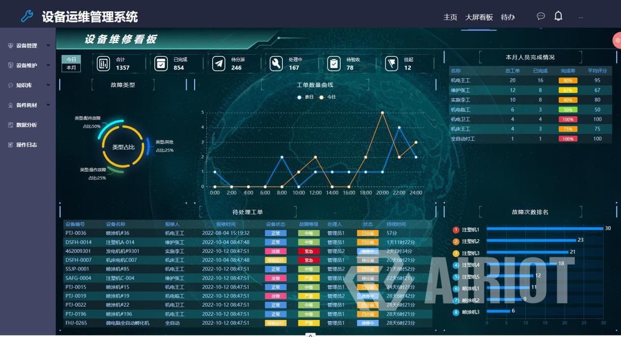系统实时展示工单梳理列表和近一个月的工单统计图表;列表统计当月人员工单完成情况;设备故障次数排名以列表形式统计展示;展示设备故障列表看板和设备按状态统计图表等。