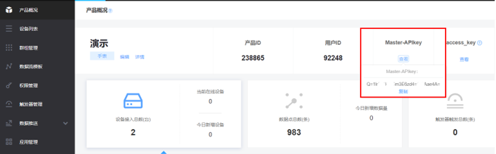 Step 1:登录https://open.iot.10086.cn/后,进入开发者中心。选择已经创建的产品,进入产品概括页面,查看产品的Master-APIkey 。
