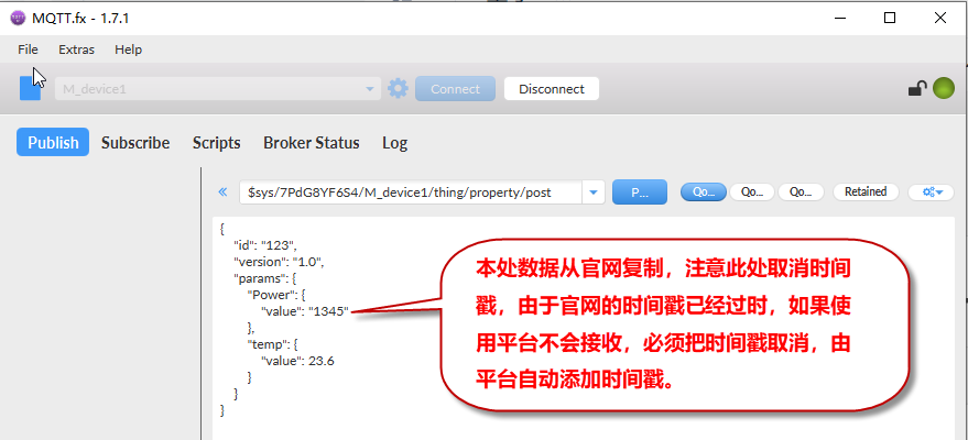 使用软件MQTT.fx,向OneNet平台上报数据。