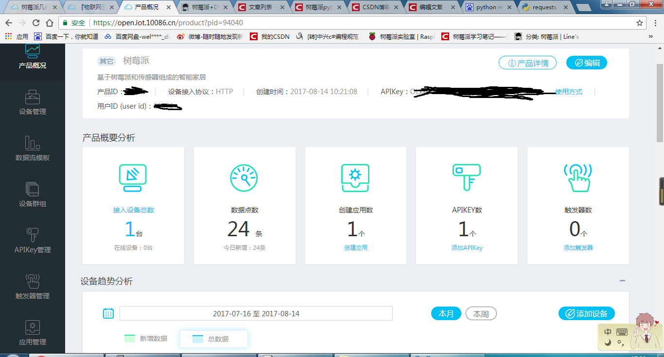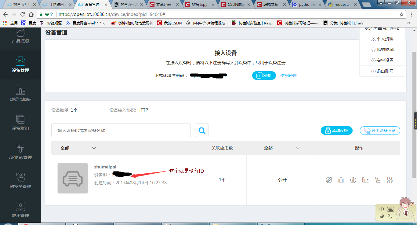 创建好之后有两个东西比较重要,一个是你的APIKey,还有一个是你的设备ID,设备ID可以在你的设备管理中看见,如图: