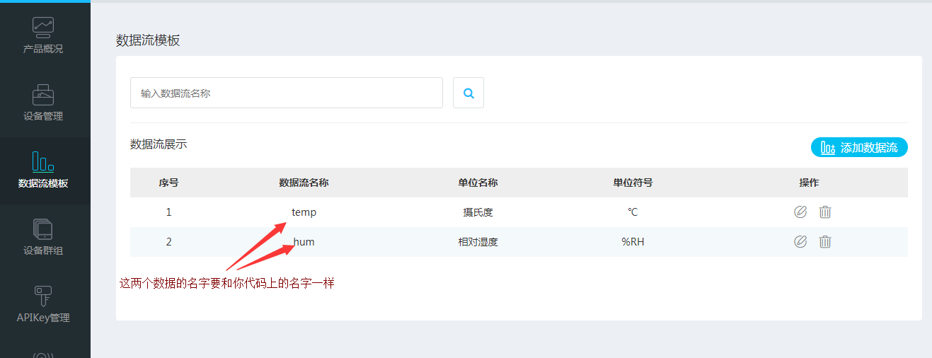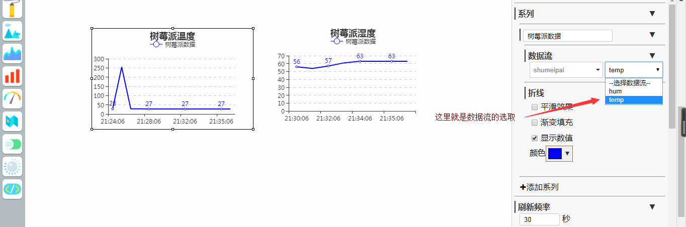 这个选择之前要在数据流管理那里创建温度和湿度数据流,你的代码的相应的数据那里也要改成和数据流名称一样的,湿度数据流t同理,一定要保证名字一样,不然就不会自动识别了,如图: