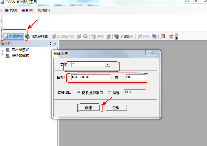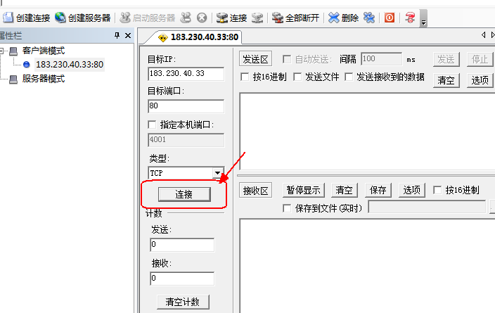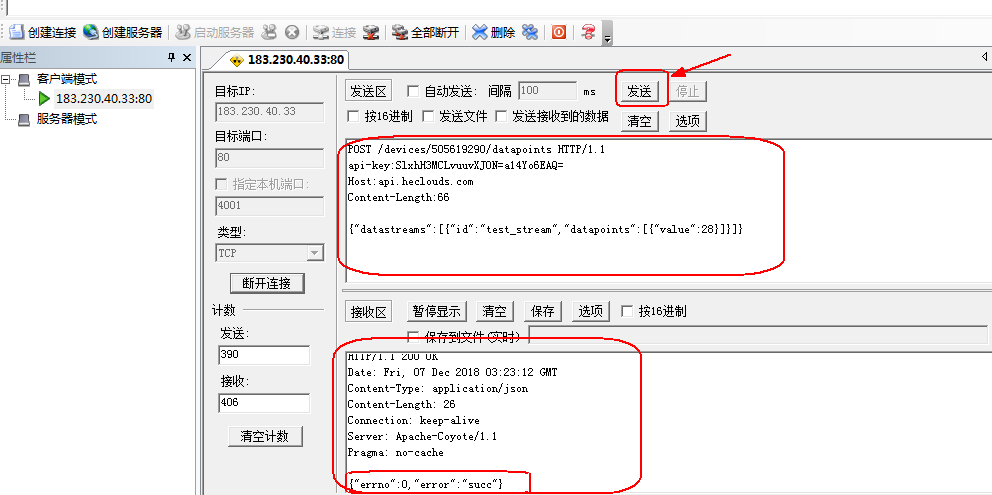 (1)打开工具,输入服务器IP地址和端口,OneNET HTTP协议 对应的服务器IP为:183.230.40.33,端口为:80。