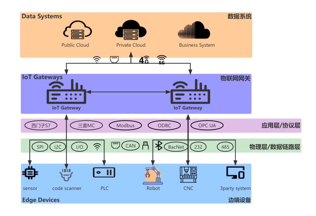 工业物联网网关(IIoTGateway)是一种硬件设备或软件程序,作为本地设备(如PLC、扫码枪、机器人、数控机床、非标上位机等)与云端系统(如物联网平台、SCADA系统、MES系统等)之间的桥梁,在设备和云端之间流动的所有数据都通过IoT网关,如下图所示: