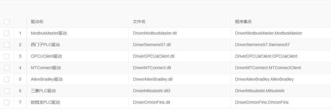驱动可以看做公司的一种无形资产。目前提供Modbus完整协议、西门子全系列PLC、三菱QPLC、欧姆龙PLC、ABPLC、MTConnect数控机床等驱动。当然你也可以通过驱动Demo实现自己的驱动,也可以集成业内流行的IoTClient(码农一生)、HSL(胡工)等提供的驱动进行整合。