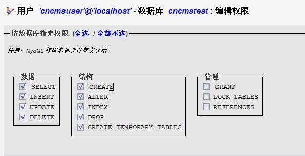 如上图,在数据库列表中选择我们刚刚创建的cncmstest,即会自动进入该数据库的权限设置页面。