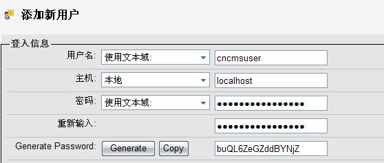 如上图,我们填写了用户名为:cncmsuser,该数据库用户只允许本机访问,主机一项选择本地;密码我们使用自动生成的,点下面的“Generate”会生成一个随机密码,然后点“Copy”会自动填写到密码框中。