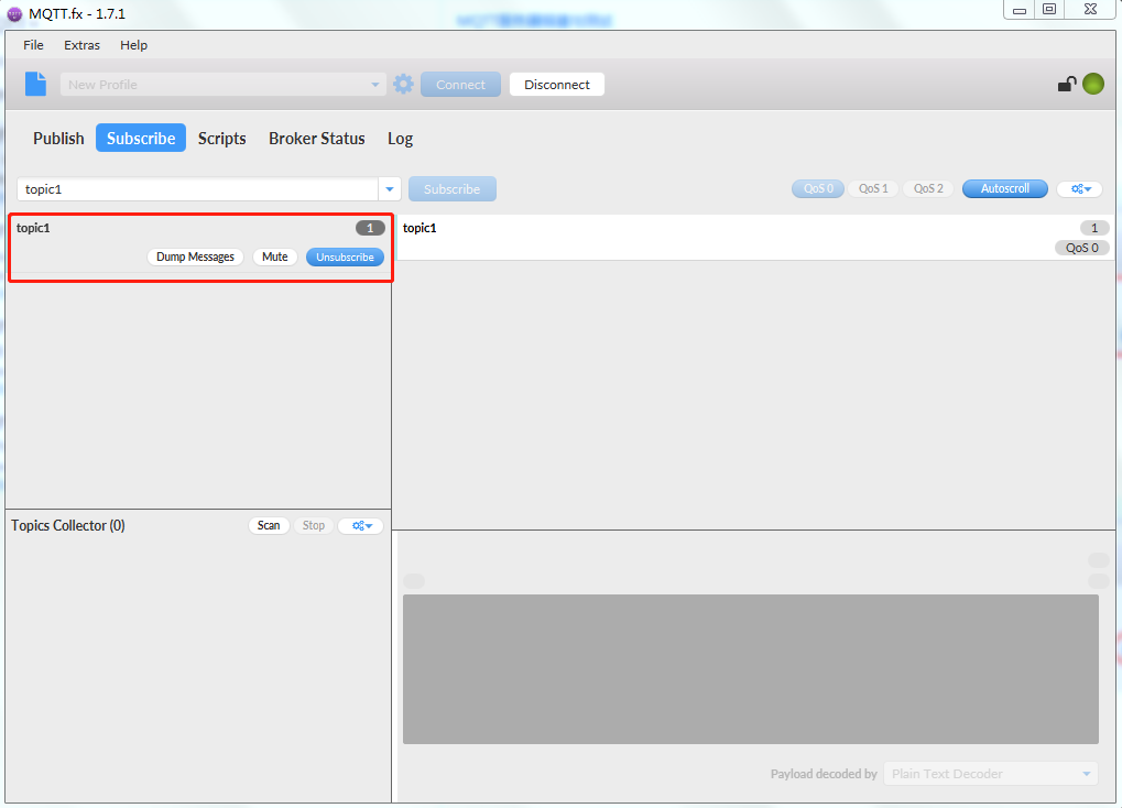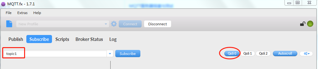 以订阅topic1为例,设置如下。切换到Subscribe页面,订阅主题为:topic1;Qos选择Qos0