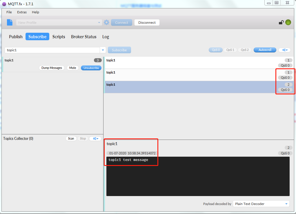 切换到Subscribe页面,看到已经收到了几条订阅的消息了,并且消息内容与上一步中发布的内容一样。