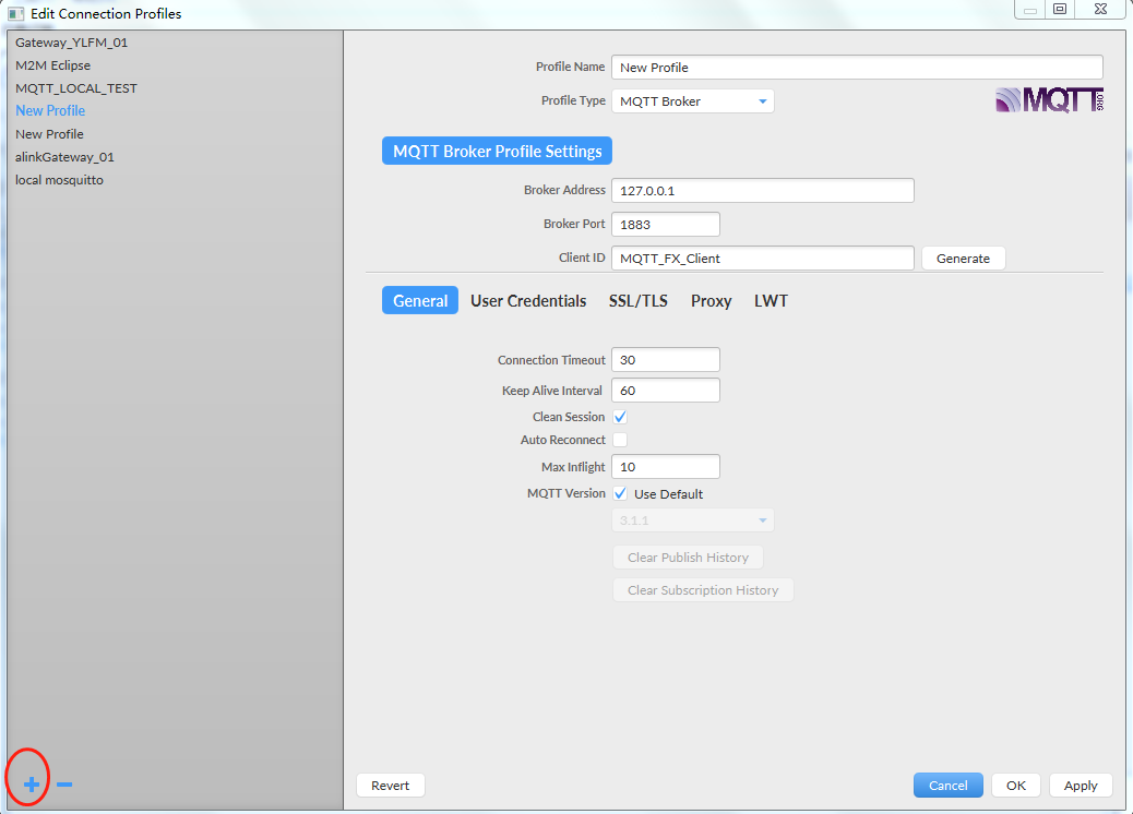 可点击第1步中红色圈的设置按键创建一个MQTT连接,如下图所示,点击左正解+号新新建连接。