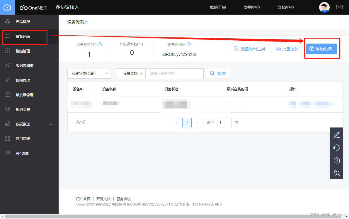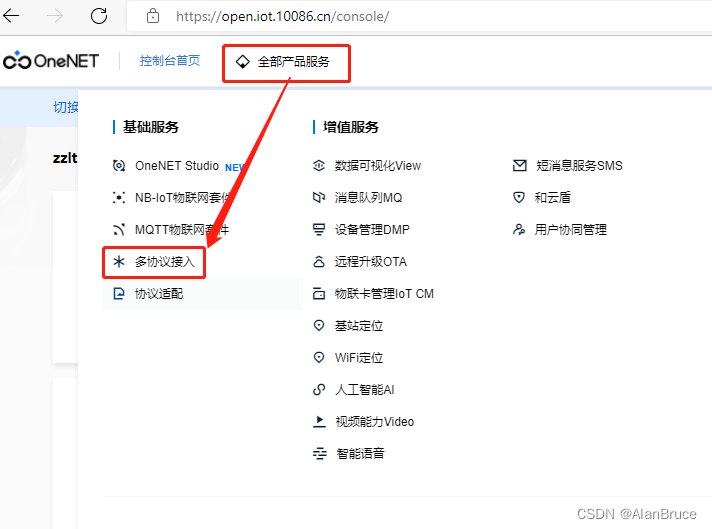 登录OneNet平台后,点击控制台,选择基础服务-多协议接入。(见图1)