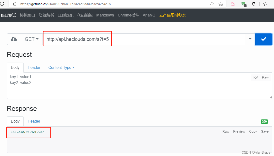 记住这个接口地址http://api.heclouds.com/s?t=5我们去浏览器上查找一个在线HTTP接口测试工具,并通过GET方法获取IP地址和端口。(图10)