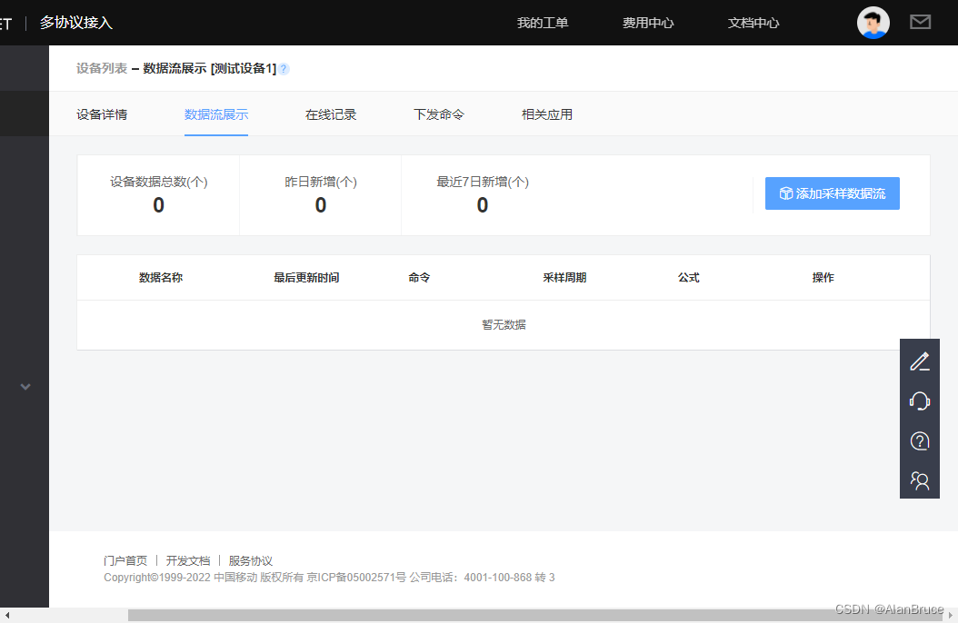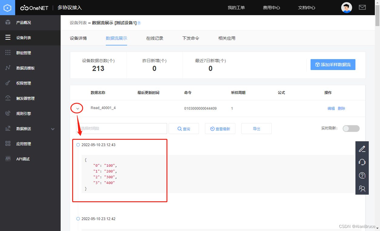 已经成功收到来自移动OneNet平台数据。接下来,返回云平台,查看数据流.。见图22
