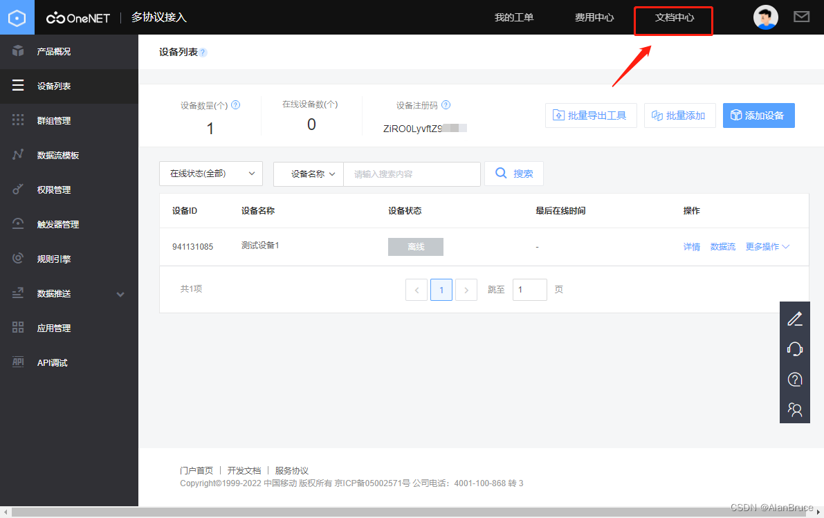 4. 接来下就需要使用MThings连接移动OneNet云平台了。在连接云平台之前,我们需要去云平台文档中心找到“多协议接入”中设备上云的方法。见(图6-8)