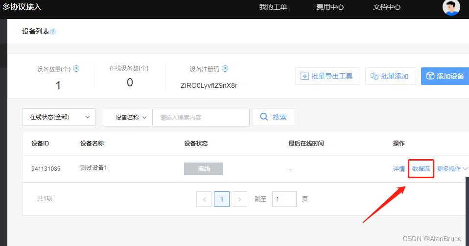 此时我们需要通过云平台遥测这4个寄存器数据,也就是说让云平台给MThings下发如下Modbus协议:01 03 04 00 00 00 04 44 09 那么我们重新回到云平台,选择“数据流”见图17-19.
