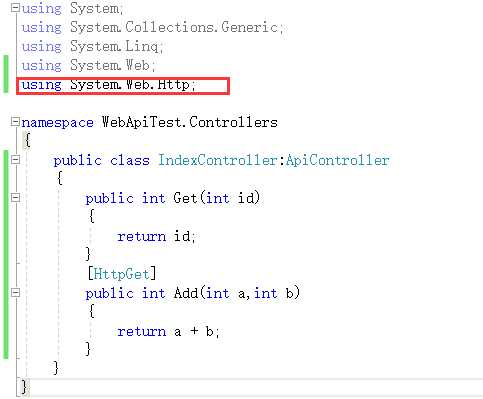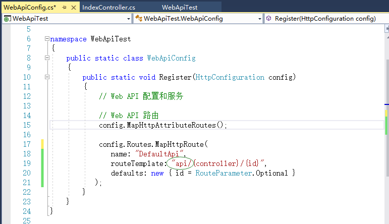 将如上图所示的WebApiConfig.cs文件中的绿圈中的“api/”去掉,则在url中可以不必包括“api/”