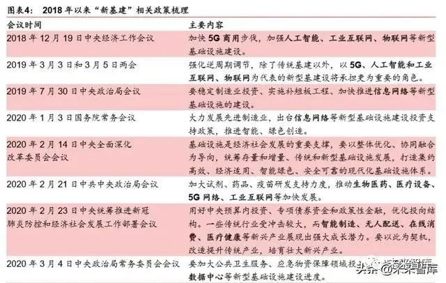 2020 年高层明确定调“新基建”作为逆周期调节的方向。 “新基建”并不是新名词,早在 2018 年底,中央经济工作会议上明确了 5G、人工智能、工业互联网、物联网等“新型基础设施 建设”的定位。随后“加强新一代信息基础设施建设”被列入 2019 年政府工作报告。2020 年 以来,为了对冲新冠疫情对经济造成的冲击,逆周期调节政策发力,并与过去的传统基建 不同,高层定调推进“新基建”。2020 年 3 月 4 日,中共中央政治局会议指出,要加大公共 卫生服务,应急物资保障领域投入,加快 5G 网络、数据中心等新型基础设施建设进度, 要注重调动民间投资积极性。
