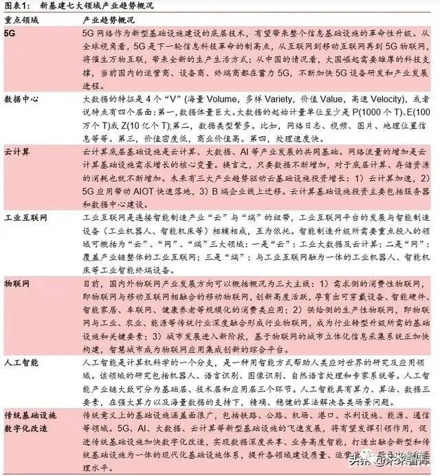 七大领域:5G、数据中心、云计算、工业互联网、物联网、人工智能、传 统基础设施数字化改造
