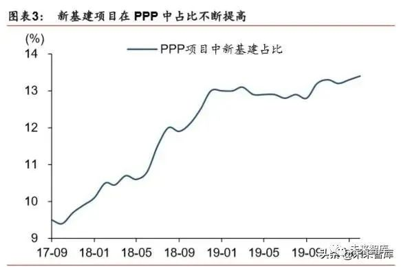 18 年中央经济工作会议首次提出“新型基建”概念,重点配套新兴产业发展,具体包括 5G 网络、数据中心、智能制造、工业互联网、物联网、无人配送、在线消费、医疗信息化等 领域。同时会议中还强调要“加大城际交通、物流、市政基础设施等投资力度”,并“补齐农 村基础设施和公共服务设施建设短板,加强自然灾害防治能力建设”。所以,更广义的新型 基础设施建设还可以包括轨道交通、环保建设等补短板领域。新型基建体量尚小但发展前 景大,符合高质量发展要求,将是政策持续支持方向。可以看到,无论是专项投向新基建 的比例,还是 PPP 项目中新基建的占比,都在不断提升。2020 年至今新增专项债投向新 基建的比例达到 24%,明显高于 2019 年全年 3%的占比;2017~2020 年国内 PPP 项目 中新基建占比总体呈提升趋势,2020 年 2 月占比达 13.4%。