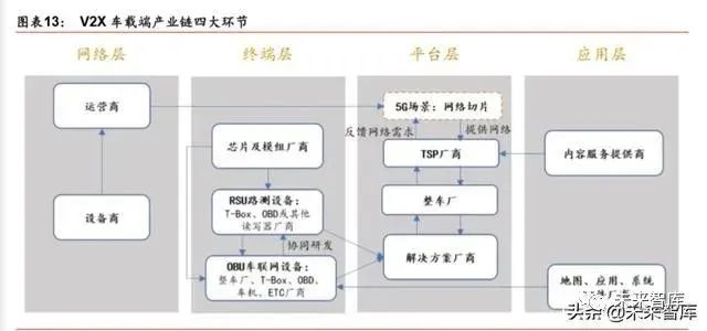 端层两个关键趋势,即车辆联网设备(T-BOX、OBU)和路侧设备(RSU)渗透率提升, 其中 V2X 有望带来新基建需求,即路侧设备,实现车与路的信息交互。另外,目前主要 依托 4G 网络,未来 5G 网络赋能,需要网络切片和边缘计算等技术叠加,涉及运营商、 设备商等。平台层和应用层将随着网络和硬件能力的逐步提升,并行发展。