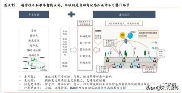 车联网是自动驾驶感知层的不可替代环节。当前的自动驾驶大多依靠雷达、摄像头、定位 等手段实现感知层信息的输入,但依靠以上技术远远不够,信息的实时交互能力和广度都 无法突破,在这一背景下车联网成为自动驾驶感知层的不可替代的环节。