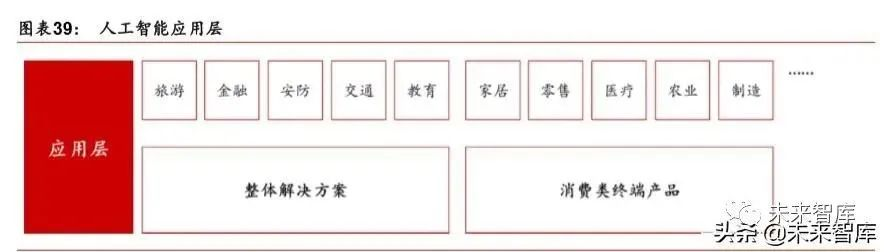 应用层按照对象不同,可分为消费级终端应用以及行业场景应用两部分。消费级终端应用 主要包括智能机器人、智能无人机以及智能硬件三个方向;行业场景应用对接各类外部行 业的 AI 应用场景,如自动驾驶、智慧金融、智慧医疗、智慧教育、智慧零售、智慧安防、 智慧营销、智慧城市等。