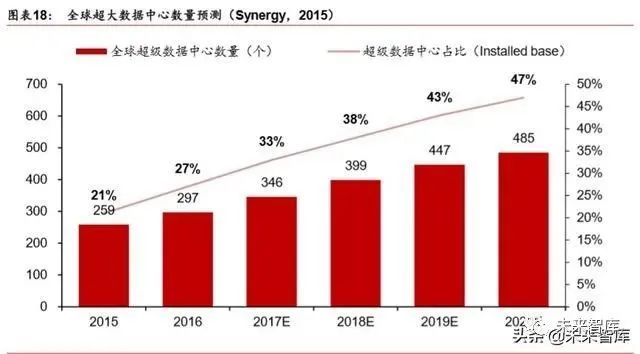 超大型数据中心数量不断增加。根据 2015 年 Synergy 做出的预测,超大规模数据中心数 量将从 2015 年的 259 个增长到 2020 年的 485 个,份额将从 2015 年 21%增长到 2020 年 47%,届时 83%的公有云服务器和 86%的公有云负载将承载在超级数据中心,处理能 力占比从 39%提升到 68%,流量占比从 34%提升到 53%。