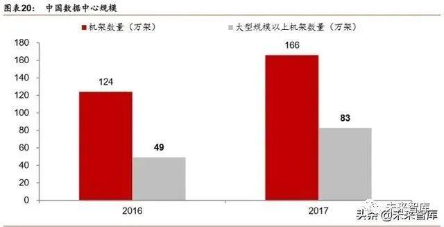根据中国信通院数据,2017 年底,中国数据中心机架数量达到 166 万架,数据中心数量 为 1844 个;规划在建数据中心规模 107 万架,数据中心数量为 463 个。从中国数据中心 发展特点来看,大型数据中心数量有望成为增长主力。截止 2017 年底,大型数据中心机 架数量超过 82 万个,同比增长 68%。