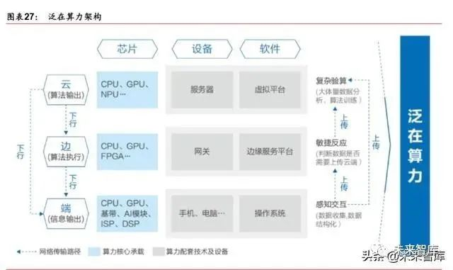泛在算力是智能社会的基石。算力在进入网络化阶段后,受到网络技术发展和网络带宽成 本限制,增设边缘侧设备成为必然趋势,未来将形成云端侧负责大体量复杂计算、边缘侧 负责简单计算执行、终端侧负责感知交互的泛在算力部署形式。整体来看,算力从单核到 多核再到网络化,算力最终走向云- 边- 端多层级泛在部署的理想方案。