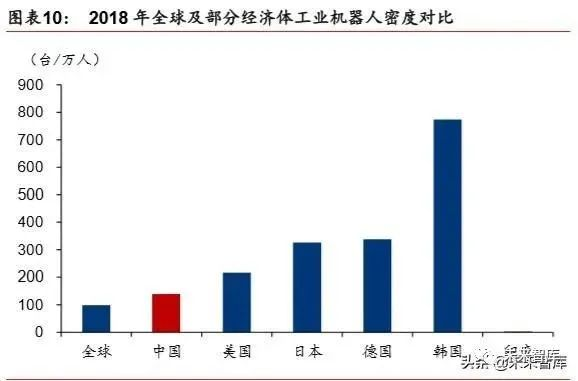 中国工业机器人密度仍明显低于全球其他制造强国, “新基建”投资或有助于中国智能制造 程度和工业机器人密度的提升。自动化生产的单元产品(机器人)是衡量一个国家自动化 水平的重要指标。虽然中国工业自动化行业规模呈现较快增长趋势,但生产制造业中自动 化率仍低于欧美发达国家。lFR 数据显示,中国自 2013 年开始成为全球工业机器人最大 市场,2018 年中国销量达 15.4 万台,占全球比重达 36%。但是,按照机器人使用密度(平 均每万名制造业工人所使用的工业机器人数量)为标准,中国的工业机器人密度为 140 台 /万人,虽然已经超过全球平均水平,但仍然显著低于美国(217 台/万人)、德国(338 台 /万人)、韩国(774 台/万人)、日本(327 台/万人)等制造业强国。我们认为,中国正处 于制造业转型升级的历史机遇期,半导体、面板、消费电子智能终端、新能源等高端制造 业产能稳步扩张,其对自动化、智能化生产所产生的工业机器人多元化需求将提高中国制 造业整体工业机器人密度,中国工业机器人市场有望进一步扩容。