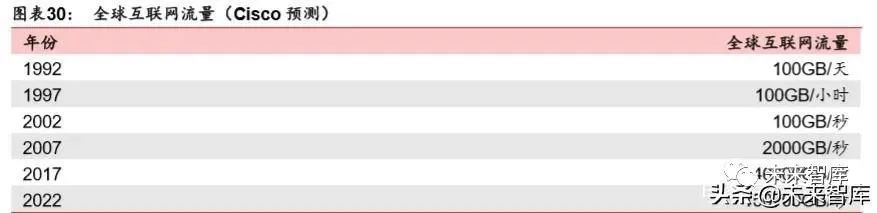 我们从流量增长的角度思考云端协同底层算力的发展对于基础设施的需求。根据思科“视 觉网络指数”(VNI),相比 2017 年,2022 年全球互联网流量将增长 153%,到每月 356 兆亿字节,其中视频占流量的 82%。到 2022 年,思科预测约三分之二(62%)的连接平 板电视机将支持 4K。到那时,4K UHD 分辨率更密集的数据要求将占全球互联网流量的 2%。自从 Cisco 2005 年首次开始 VNI 预测以来,2005-2018 年,流量增长了 56 倍,累 计有 36%的年复合增速。