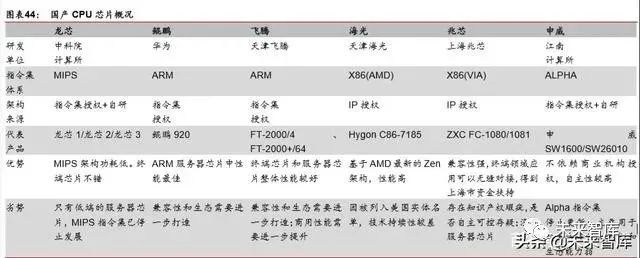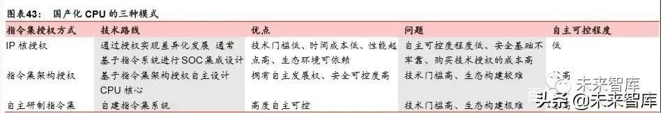 自主研发CPU需要得到指令集授权。在国产芯片厂商中,华为鲲鹏和飞腾获得了 ARM 公 司 64 位 ARM V8 指令集的架构授权,有权设计、生产、销售 ARMv8 兼容处理器产 品。龙芯、申威分别获得 MIPS 架构和 ALPHA 架构的授权,自主研发处理器内核,并 在此基础上,对相关架构指令集进行了扩展。基于两种指令集授权模式,加上国内一些厂 商自建指令集系统,CPU 国产化的方式主要有三种: