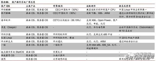 国内操作系统厂商主要有麒麟 OS(中标麒麟、银河麒麟)、深度科技、普华软件、中兴新 支点、凝思、中科方德等公司。各公司简要概况见下表。