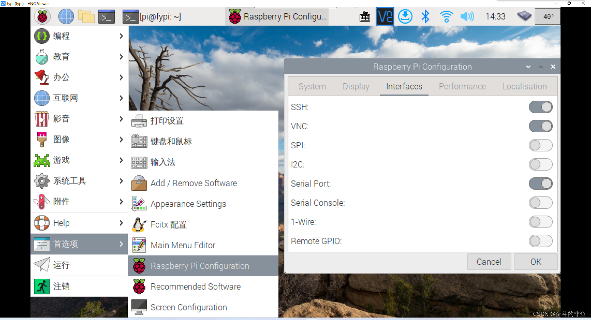 第一步,我们需要在树莓派端打开串行端口选项,如下图所示: