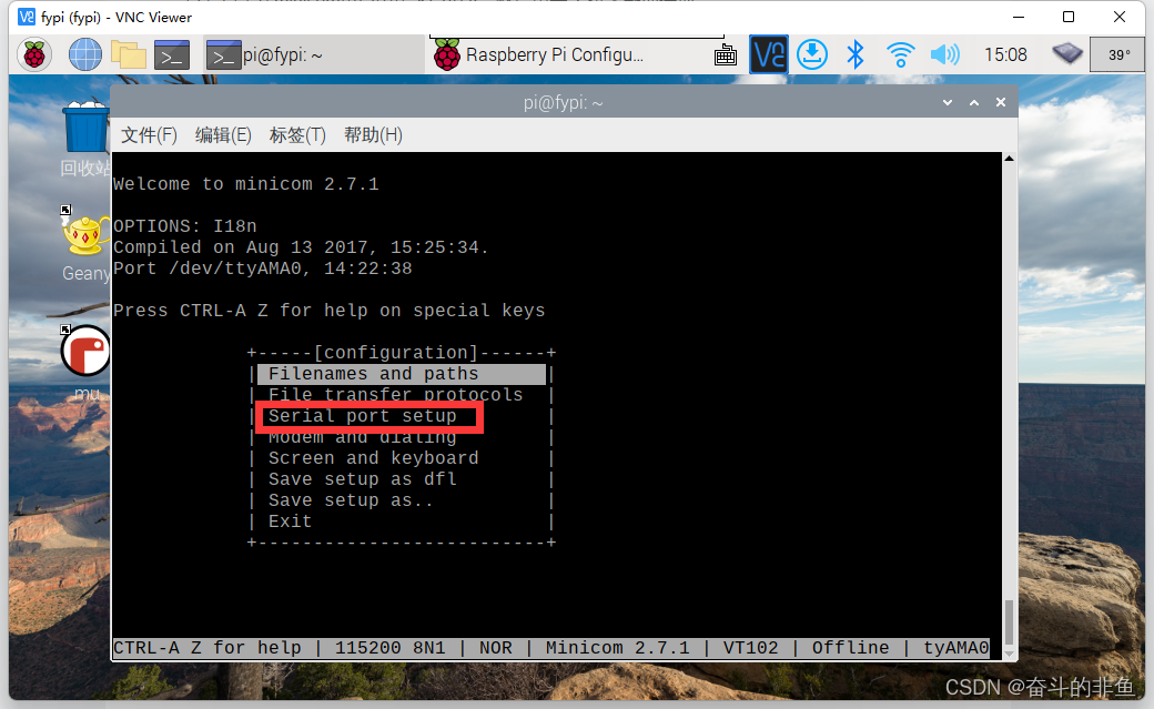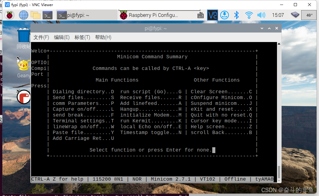这里 -D /dev/ttyAMA0 就是指向我们打开的串口端口号,和COM1这种是一样的, -b 115200是配置波特率,这一项我们在minicom中输入 Ctrl+A 在下方也是可以看到我们的波特率的,如果不设置 -b ,波特率默认会是115200,可以动手尝试一下。