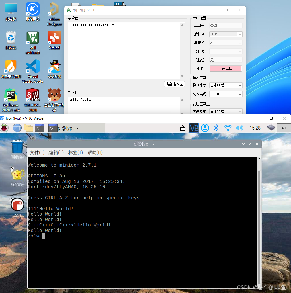 我们把USB转TTL的TXD接入树莓派的RXD,把USB转TTL的RXD接入树莓派的TXD,然后将GND相连接,插入电脑的USB接口中,打开电脑上的串口助手,同时打开树莓派端的minicom。