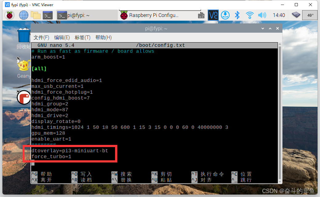 打开终端,输入 sudo nano /boot/config.txt ,滚轮到末尾最下方,加入这两行内容: