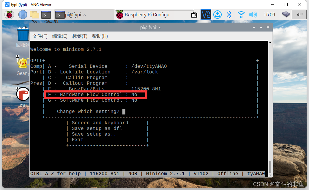 (3)选择Serial port setup选项,按下 F 将 Hardware Flow Contorl 改为No,即禁用硬件流,然后退出,大功告成。