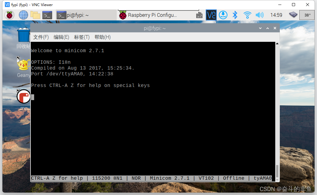 在终端输入命令: minicom -D /dev/ttyAMA0 -b 115200 ,回车即可进入。