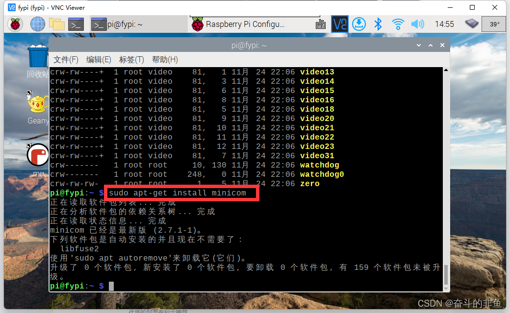 打开终端,输入 sudo apt-get install minicom 等待安装完成,过程中提示就不用多说了,Y。