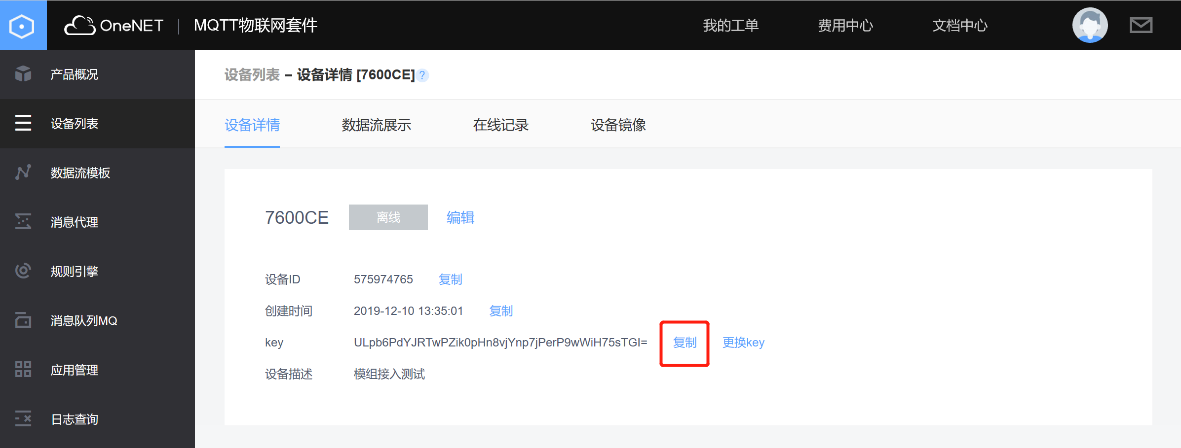 在打开的设备详情页中复制key,如下图所示: