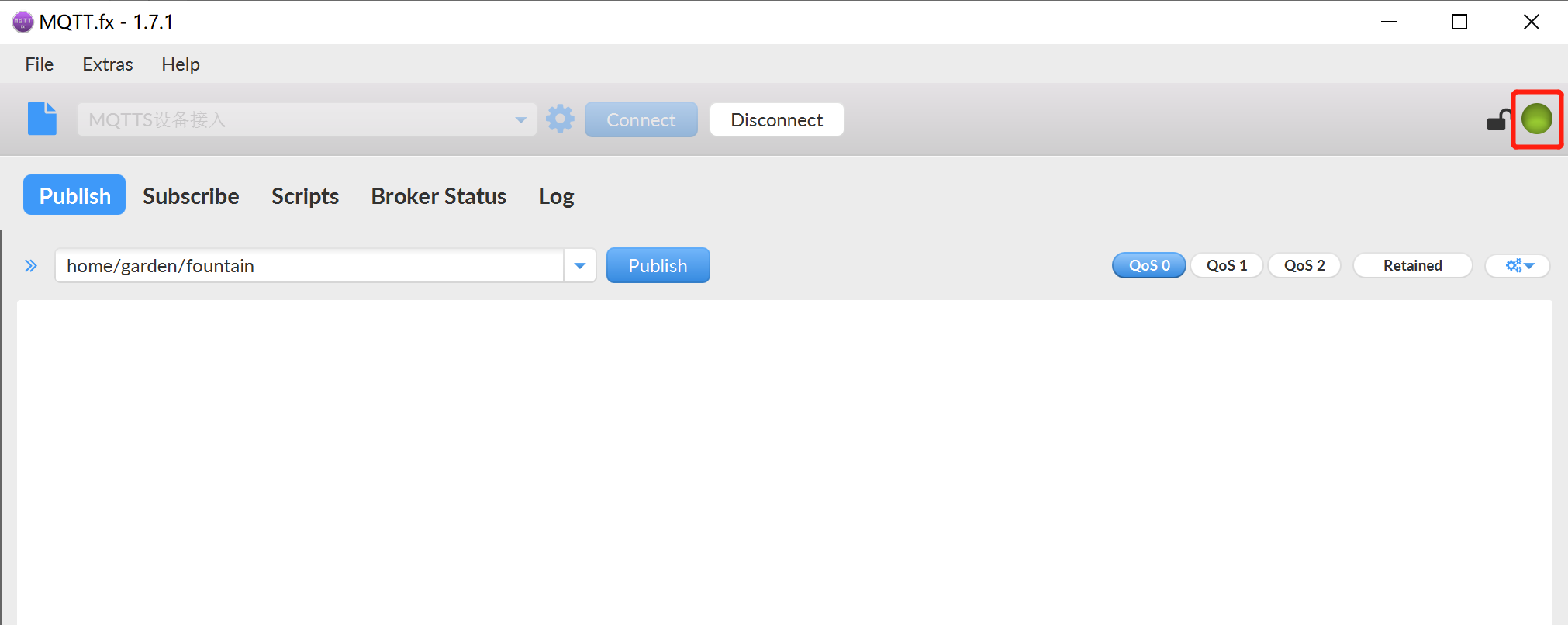 最后单击Connet蓝色按钮,连接OneNET平台的MQTT服务器。成功连接上MQTT服务器后,灰色的指示灯会变成绿色。如下图所示: