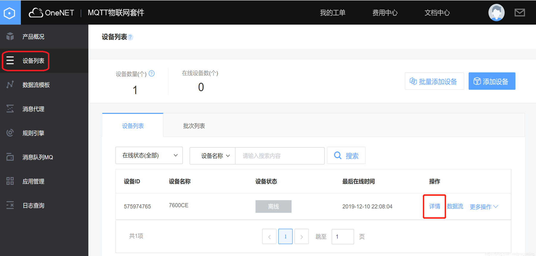 ③、key:这里填入的key指的是选择设备的key;在MQTT物联网套件下的设备列表中选择需要模拟设备名称,点击详情,如下所示: