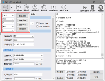 (1). 恢复出厂设置: 打开TAS_LTE_362 V2.0.9.exe软件,左上角点击打开串口,设置串口参数。