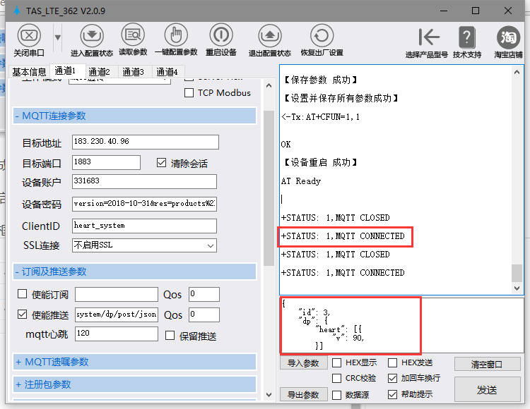 等待设备重启, 重启后会出现+STATUS: 1,MQTT CONNECTED;