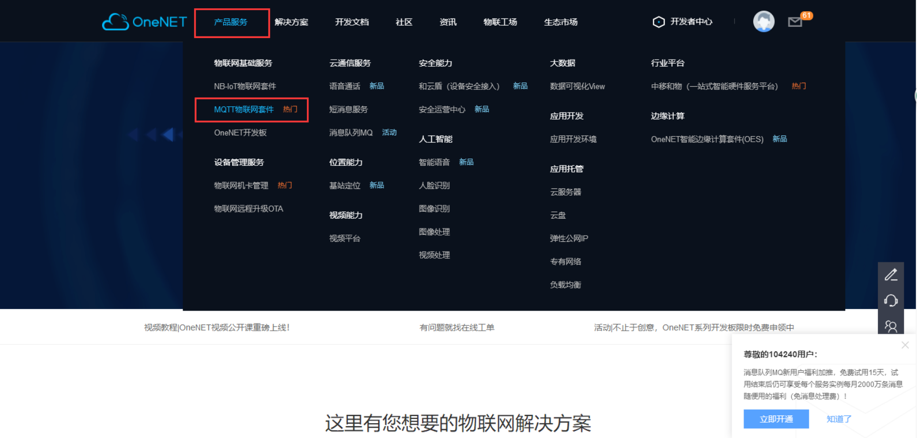 2.选择产品服务-MQTT物联网套件,创建产品是选择多协议接入-MQTT旧版-添加产品,创建产品时网络选择蜂窝移动网,协议选MQTT旧版,其余选项选其他就行