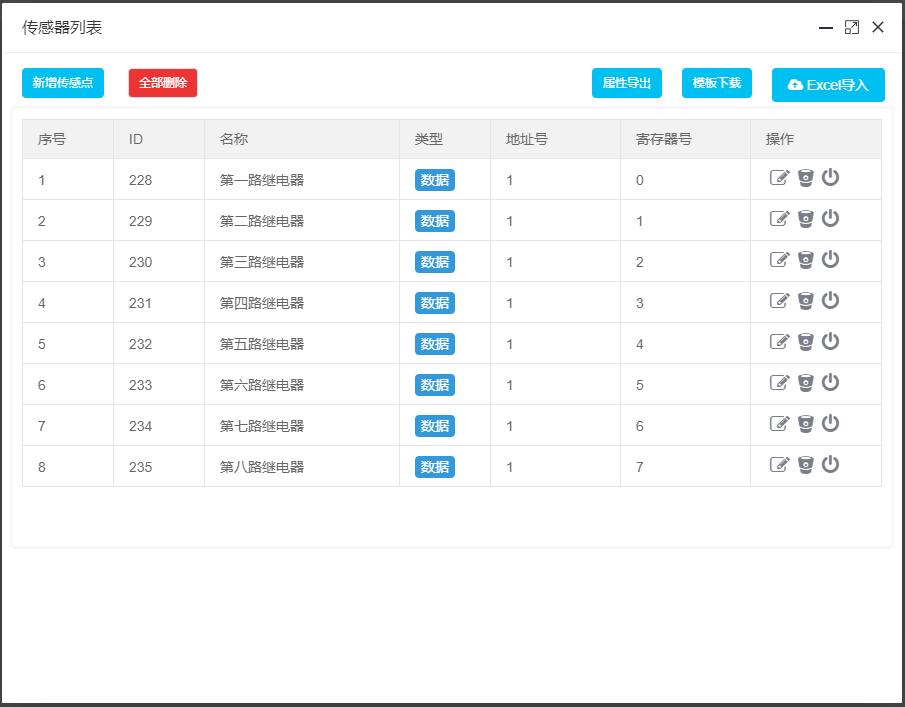 依次添加8路继电器,只需修改寄存器号即可。
