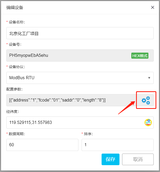 - 填写设备名称,随机生成或者手动填写设备号,在设备协议中选择ModBus RTU,定位设备所在经纬度,保存即可。(设备号复制保存备用)