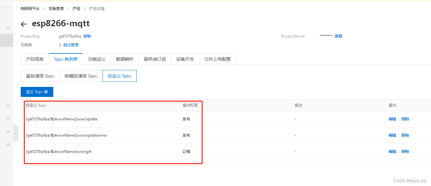 自定义topic主题,权限为订阅、发布,软件测试需用到。