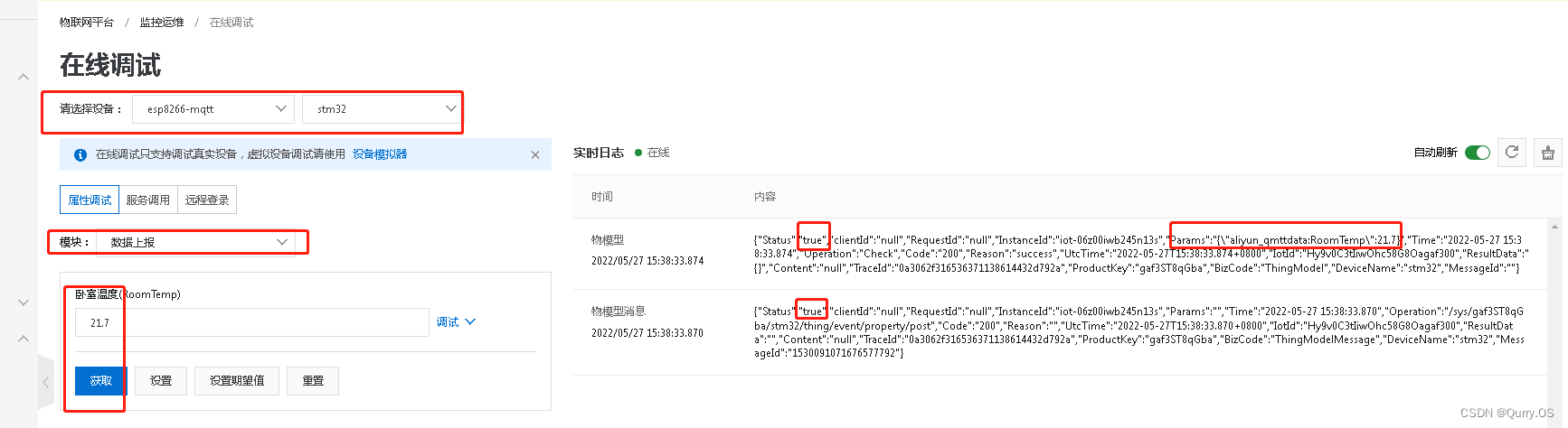 阿里云中开启在线调试,设备端按KEY_UP按键连接上阿里云后,按KEY_0键发布数据,然后使用在线调试功能获取相应模块的数据,验证成功。