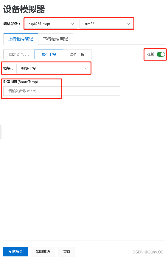 使用设备模拟器进行上、下行数据的调试,使用模拟器的前提是 产品创建时设置的数据格式是ICA 标准数据格式(Alink JSON),透传格式不可以使用模拟器调试。